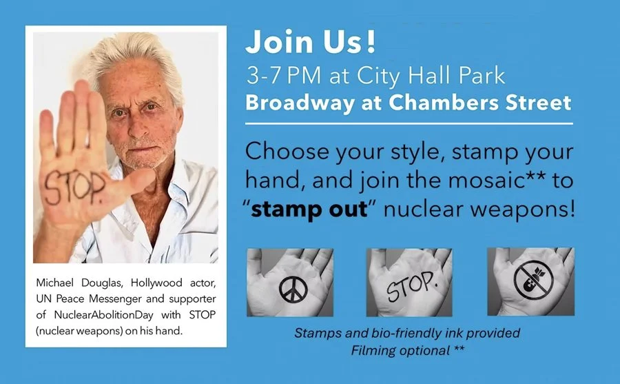 offers everyone a unique opportunity to be a part of a multimedia action to say "stop" to nuclear weapons. Peace is in Our Hands: A Participatory Multimedia Creation, will take place outside at New York City Hall Park (on the Broadway sidewalk at Chambers Street). Choose a hand stamp and add your mark to this piece of public art being created for Nuclear Abolition Day. Be one of the many individuals around the world, including UN Peace Messenger Michael Douglas, who have already stamped their hands to "stamp out" nuclear weapons! * You will also have the chance to be filmed by an international production team and contribute to a piece of public art in the heart of downtown Manhattan.**