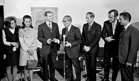 UN Secretary-General U Thant presenting the astronauts with gold peace medals and albums of United Nations stamps. Left to right: Mrs. Irwin, Mrs. Scott, Colonel David R. Scott, U Thant, Lieutenant-Colonel Alfred M. Worden, Ambassador George H. Bush, Permanent Representative of the United States to the U.N., and Colonel James B. Irwin.
